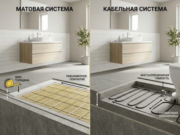 👉 Вывод: если нужен электрический тёплый пол под плитку — лучше выбирать кабель или маты.