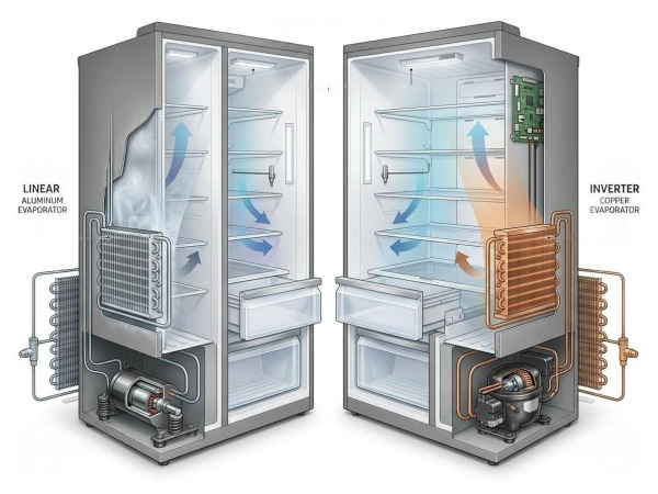 Вот реальная история. Модель A (20 000 руб.) с виду — копия модели B (32 000 руб.). Обе — двухкамерные, с No Frost. Но у A — линейный компрессор и алюминиевый испаритель. У B — инверторный компрессор и медный испаритель. Разница в цене — 12 000 руб. Разница в сроке службы — 5 лет против 12. Не покупайте холодильник, не сверив таблицу ниже.