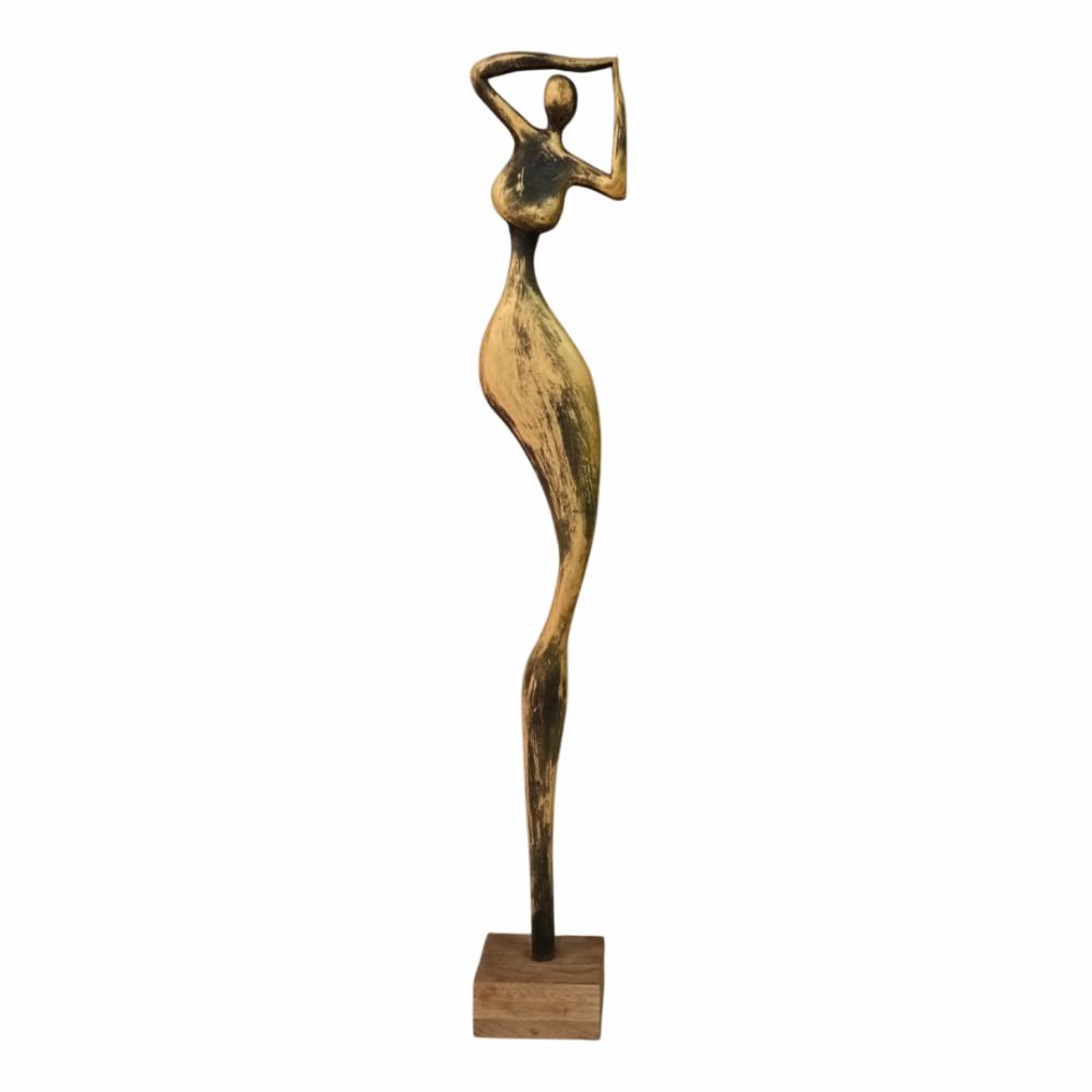 Эта статуэтка высотой 1 метр — гимн женской красоте и мастерству художника. Каждая линия и изгиб тела тщательно вырезаны вручную из массива дерева. Мерцающая золотая патина подчеркивает плавность силуэта, превращая скульптуру в источник теплого, сияющего света и утонченной эстетики в вашем пространстве.