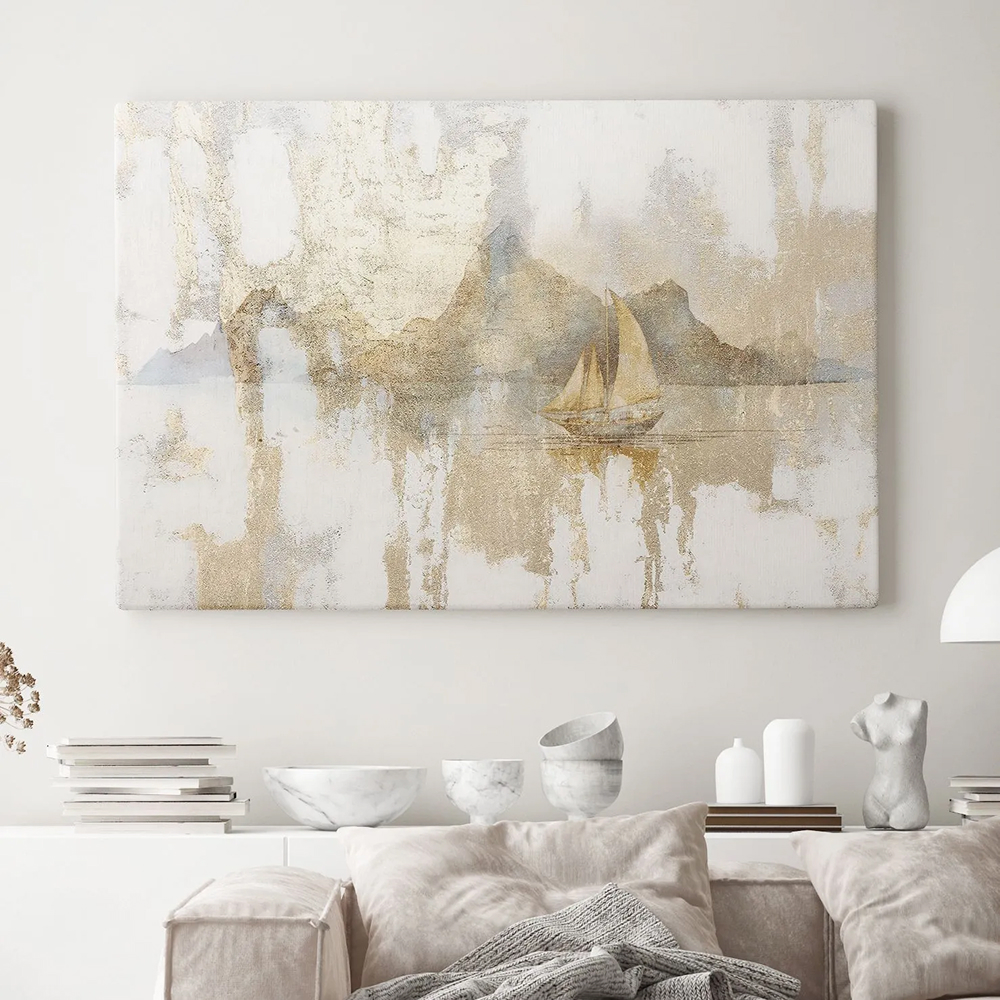 Комплектация: Картина для интерьера "Кораблик в горах" 1 шт. размер 30х45 см. горизонтальная с предустановленным креплением на подрамник.