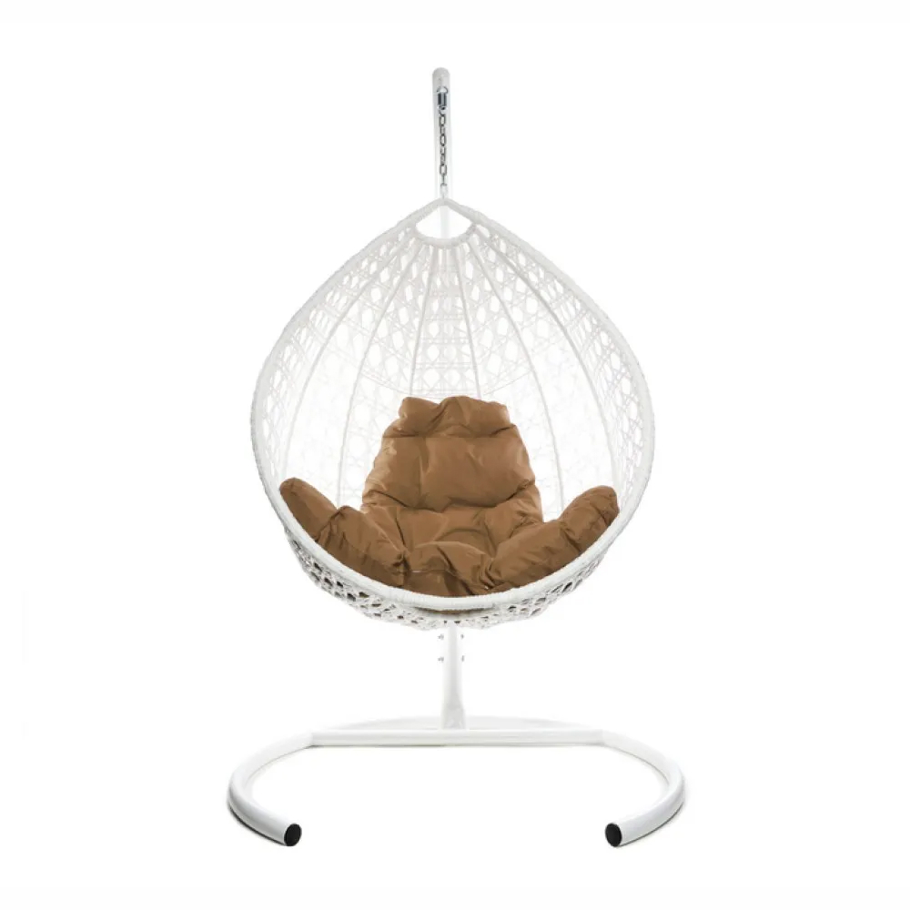 - Комплект подвесное кресло Капля Люкс с ротангом белое, бежевая подушка