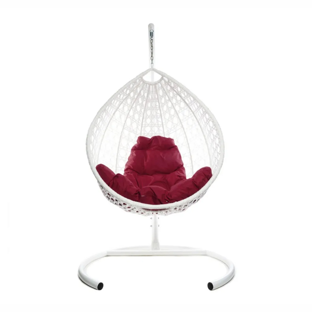 - Комплект подвесное кресло Капля Люкс с ротангом белое, бордовая подушка