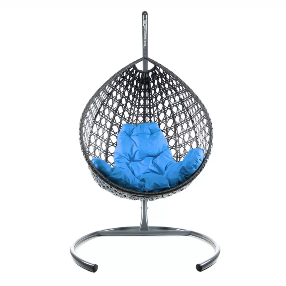 - Комплект подвесное кресло Капля Люкс с ротангом серое, голубая подушка