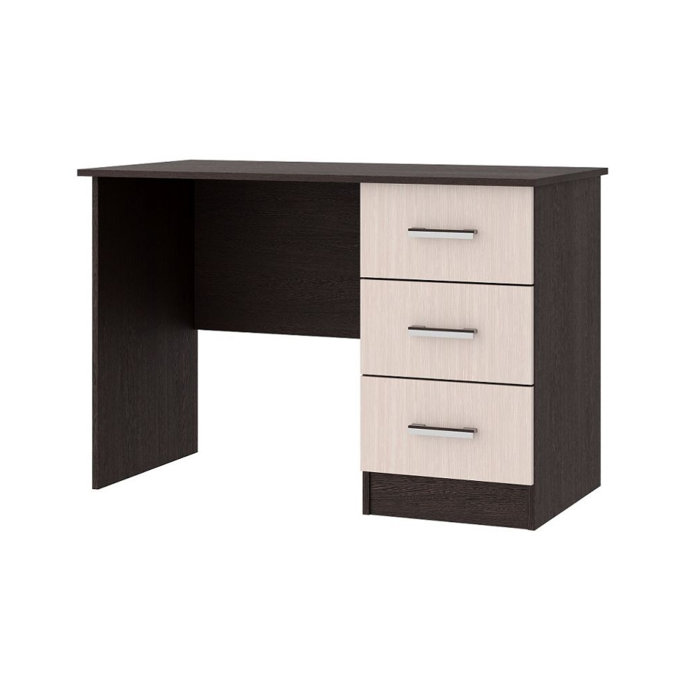 Письменно-компьютерный стол ПКС-3 с 3-мя ящиками на роликовых направляющих. Столешница обработана кромкой толщиной 1 мм, что делает работу за столом более комфортной и удобной. Чёрная матовая металлическая ручка. Рабочая зона стола 1118 х 570 мм.