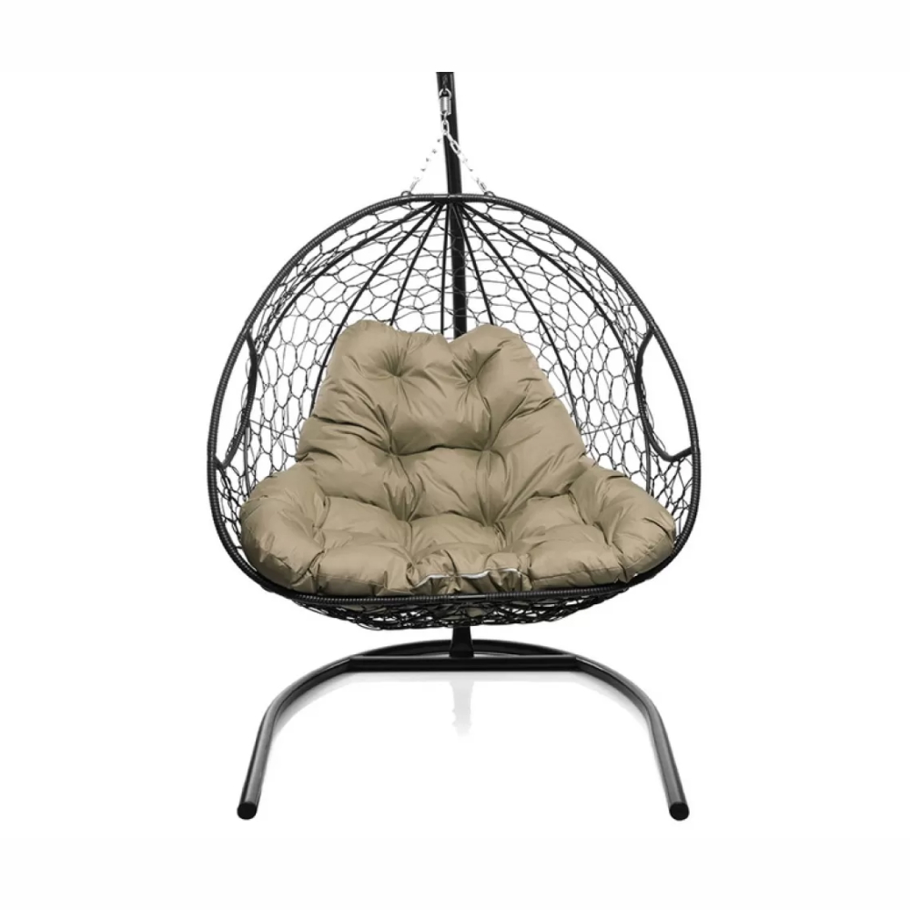 - Подвесное кресло для двоих с ротангом черное, бежевая подушка