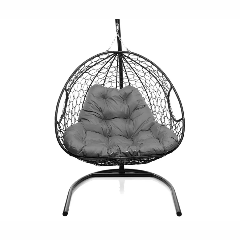 - Подвесное кресло для двоих с ротангом черное, серая подушка