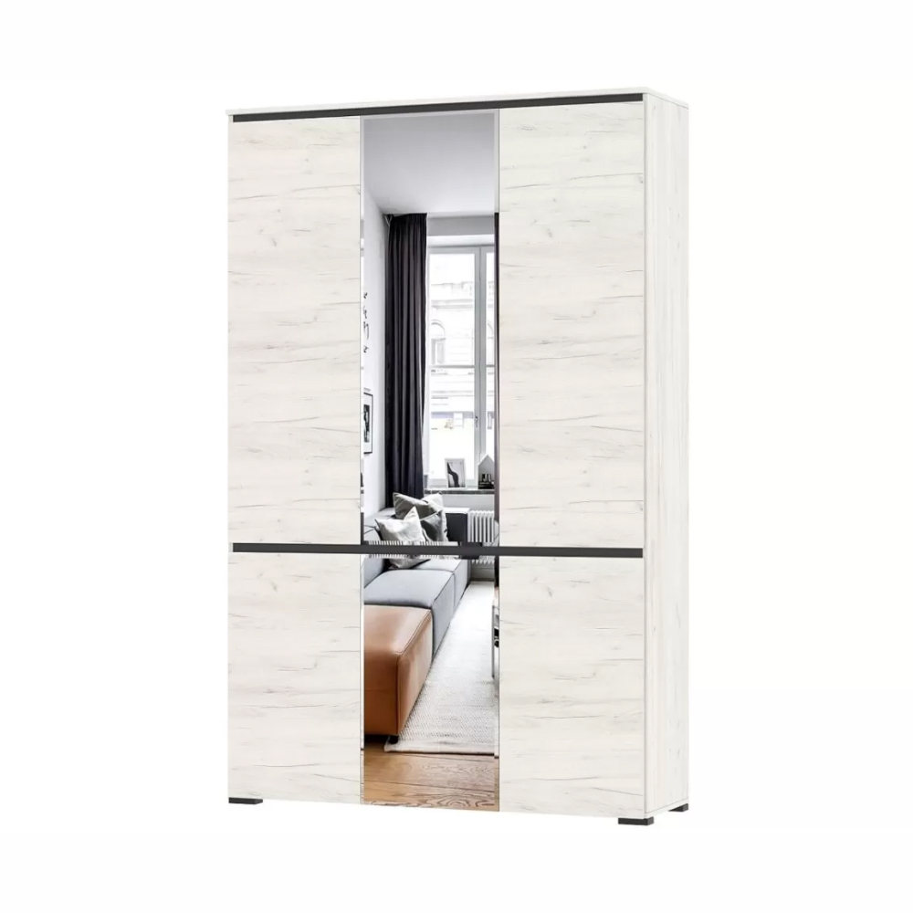 Шкаф 4С2ЗР "ГРЕТТА" 6-створчатый, с поперечной металлической штангой для верхней одежды, с полками. Применение интегрированной ручки на фасадах делает модель стильной и безопасной – дверцы открываются за профилированные выступы. Фасады обработаны кромкой 1 мм. Чёрная регулируемая ножка-опора.