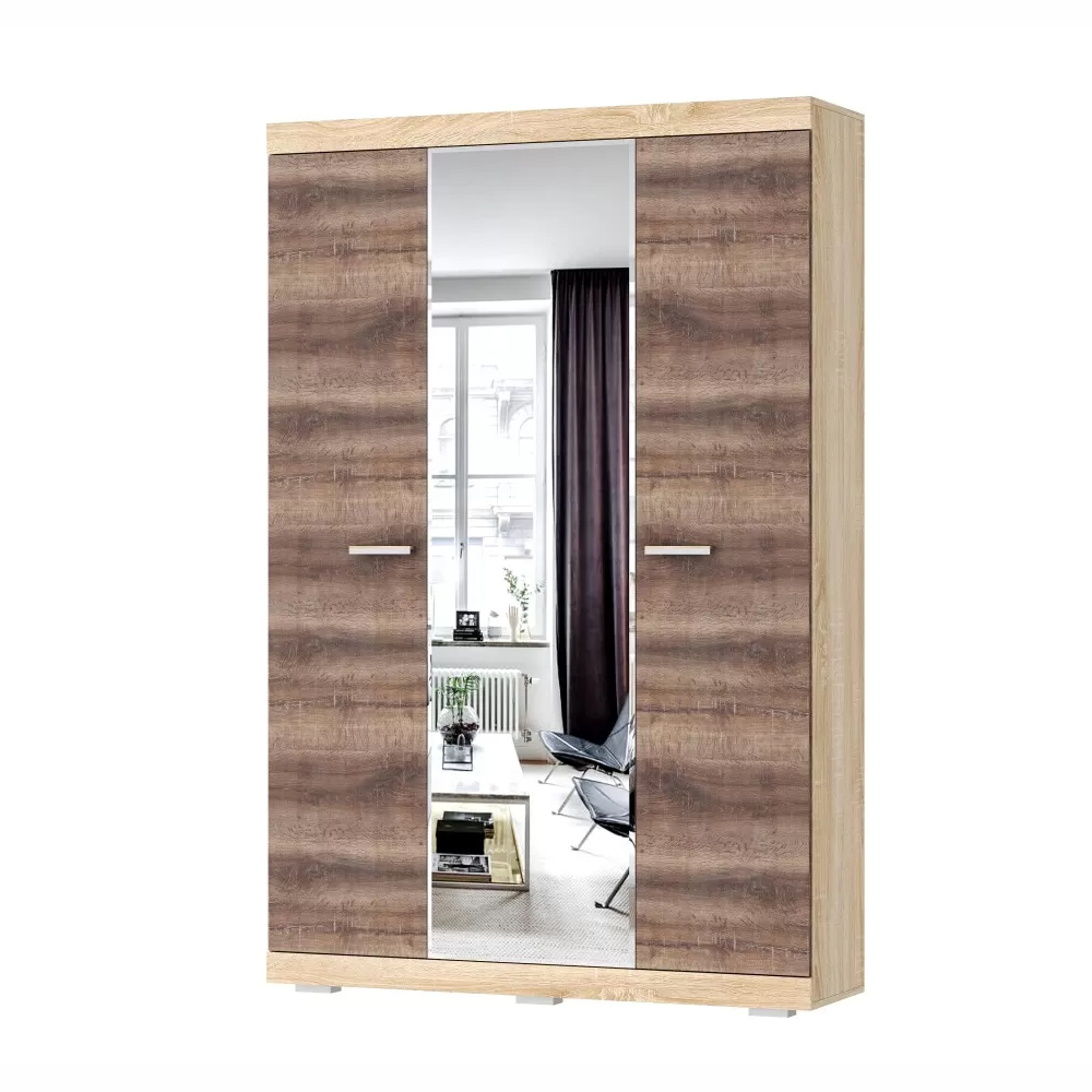 Шкаф "СОНАТА" ШСЗ-1300 трёхстворчатый с зеркалом, с полками и выдвижной штангой для верхней одежды. Верхняя и нижняя части шкафа обрамлены профилем MDF. Зеркало выполнено с изящной и красивой обработкой "фацет" по периметру.