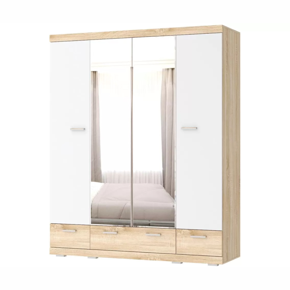 Шкаф "СОНАТА" ШСЗ-1800 четырёхстворчатый с зеркалами, с полками, металлической штангой штангой для верхней одежды и тремя ящиками на направляющих полного выдвижения. Верхняя и нижняя части шкафа обрамлены профилем MDF. Зеркала выполнены с изящной и красивой обработкой "фацет" по периметру.