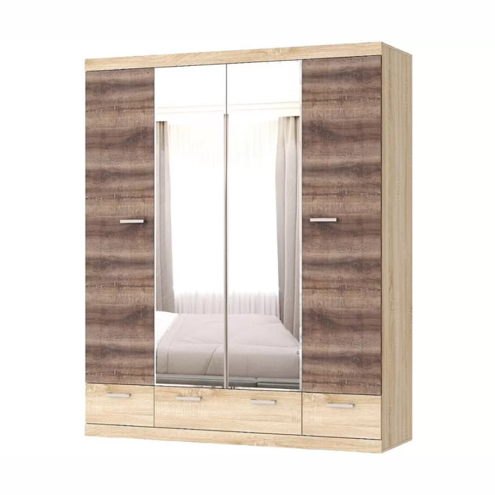 Шкаф "СОНАТА" ШСЗ-1800 четырёхстворчатый с зеркалами, с полками, металлической штангой штангой для верхней одежды и тремя ящиками на направляющих полного выдвижения. Верхняя и нижняя части шкафа обрамлены профилем MDF. Зеркала выполнены с изящной и красивой обработкой "фацет" по периметру.